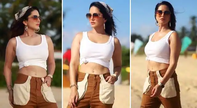 इन तस्वीरों में सनी लियोनी व्हाइट बॉडीहगिंग क्रॉप टॉप और ब्राउन ट्राउज़र में ग्लैमर का तड़का लगाती नजर आ रहीं हैं।