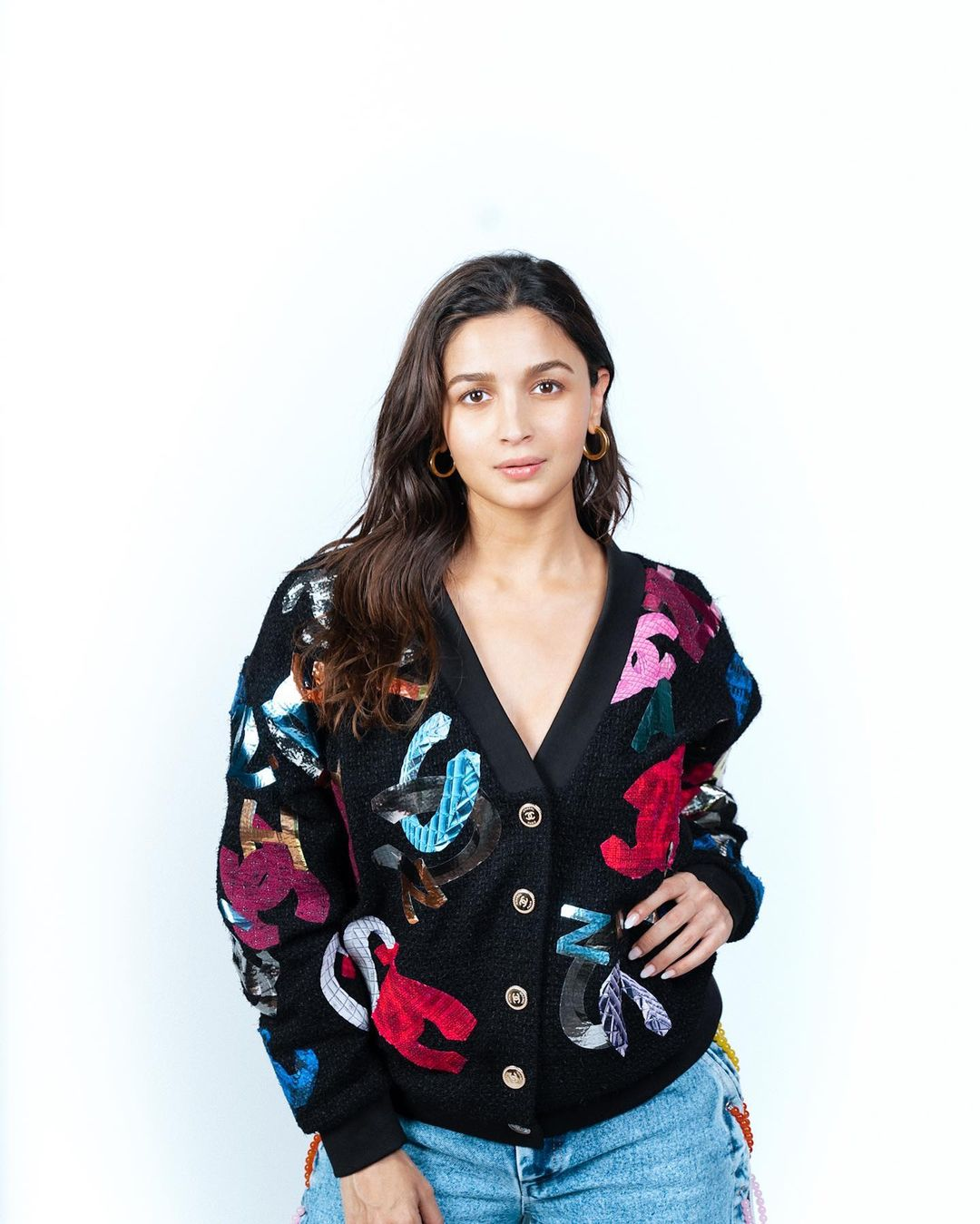 Alia Bhatt is acing the pregnancy style game effortlessly. The Darlings star looks cosy in the colourful cardigan worn with denims for an interview.