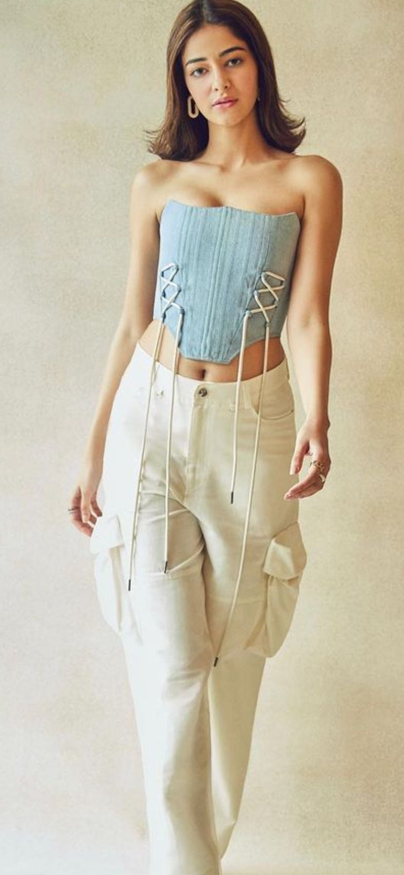 In the photos, Ananya Panday is seen in a blue strapless crop corset top and high-rise baggy cargo pants.