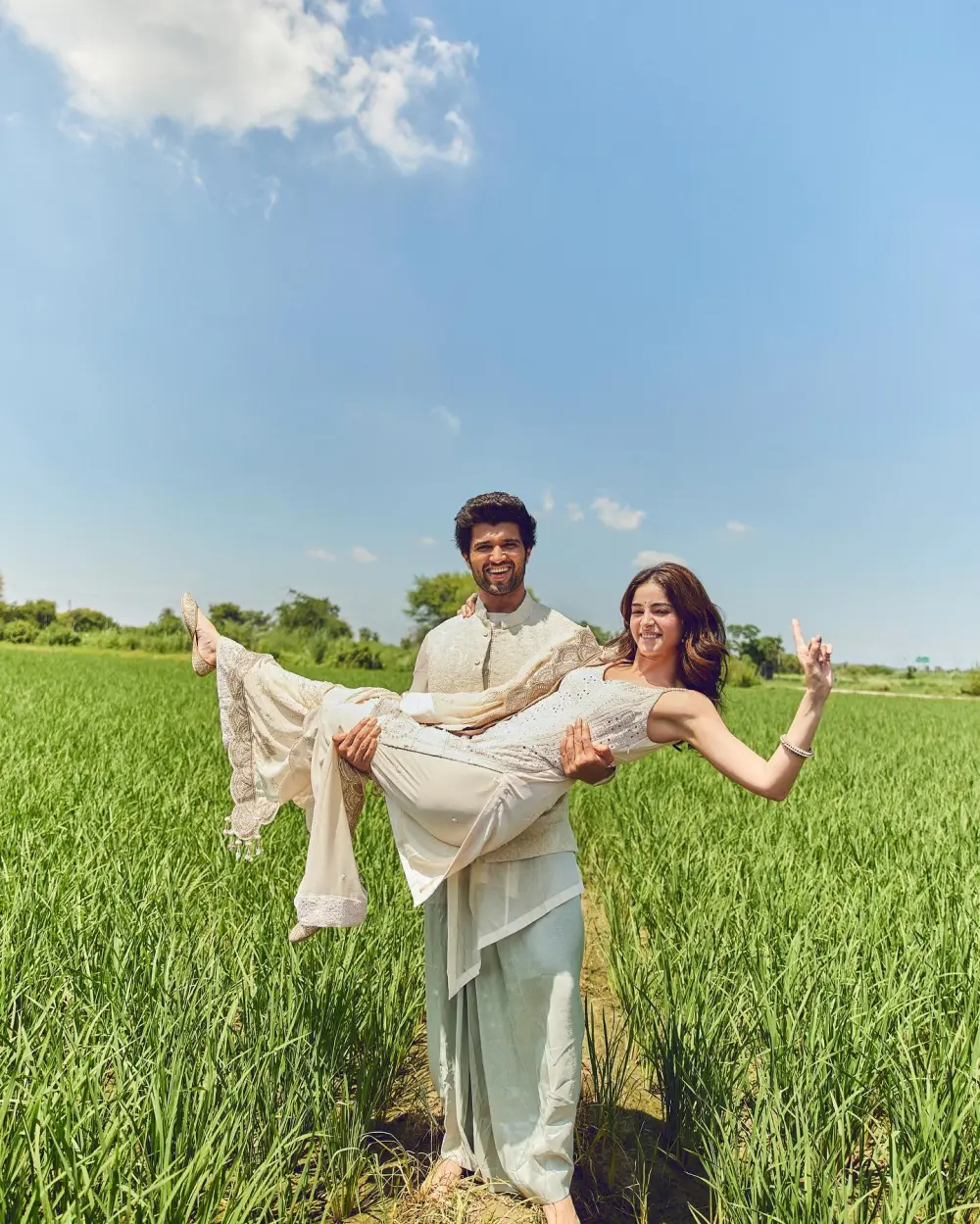 Vijay Deverakonda complemented Ananya in a white cotton bandhgala kurta and a pastel grey dhoti.