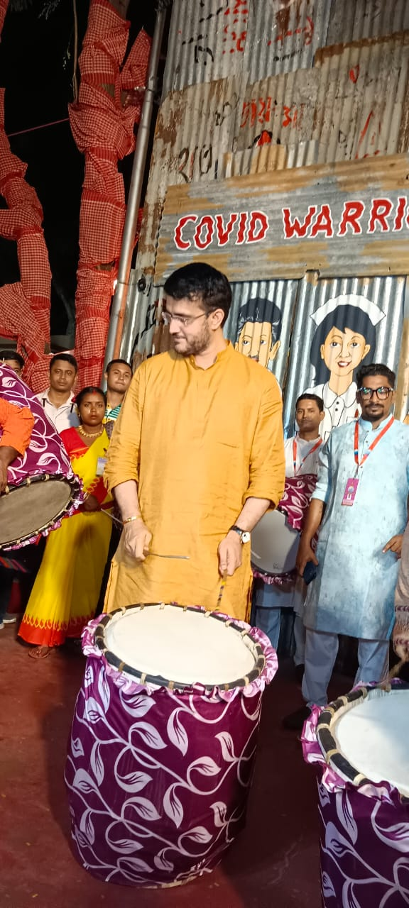 BCCI President Sourav Ganguly showcases his dhaal playing skills during Durga Puja in Kolkata