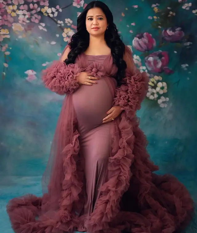 भारती ने पर्पल कलर का रफल गाउन पहना हुआ है। उन्होंने बालों को खुला रखा है।