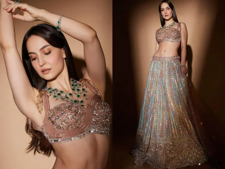 शेयर की गई इन तस्वीरों में एली स्कीन कलर का स्पार्कल लहंगा पहने हुए कातिल पोज दे रही हैं.