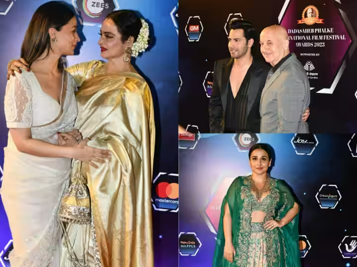 वहीं बात करें इंडस्ट्री की एवरग्रीन एक्ट्रेस रेखा की तो वो हर बार की तरह गोल्डन कलर के चौड़े बॉर्डर वाली कांजीवरम साड़ी में नजर आईं.