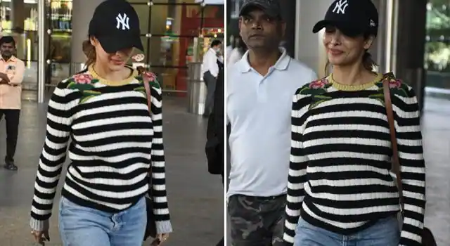 इन फोटोज़ में मलाइका अरोड़ा ब्लैक एंड व्हाइट स्ट्रिप्स वाली स्वेटर और डेनिम जींस में बेहद गॉर्जियस लग रही हैं।
