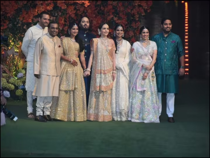 अनंत अपनी इंगेजमेंट सेरेमनी में टील ग्रीन कलर के ट्रेडिशनल कुर्ता में नजर आ रहे हैं. वहीं राधिका ने गोल्डन कलर का लहंगा कैरी किया है. कपल बेहद खूबसूरत लग रहा था.