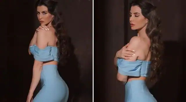 फोटोज़ में जॉर्जिया एंड्रियानी स्काई ब्लू कलर की ट्राउज़र और क्रॉप टॉप में बेहद हॉट लग रही हैं।