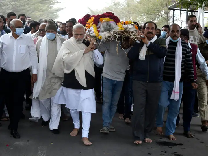 पीएम मोदी अपनी मां हीराबेन को अंतिम यात्रा पर ले जा रहे हैं. उन्होंने मां के पार्थिव शरीर को कंधा दिया है.
