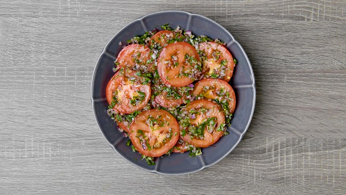Fresh juicy tomatoes marinating in zesty vinegar, olive oil, and herbs makes a perfect healthy summer salad, a topping or a side dish