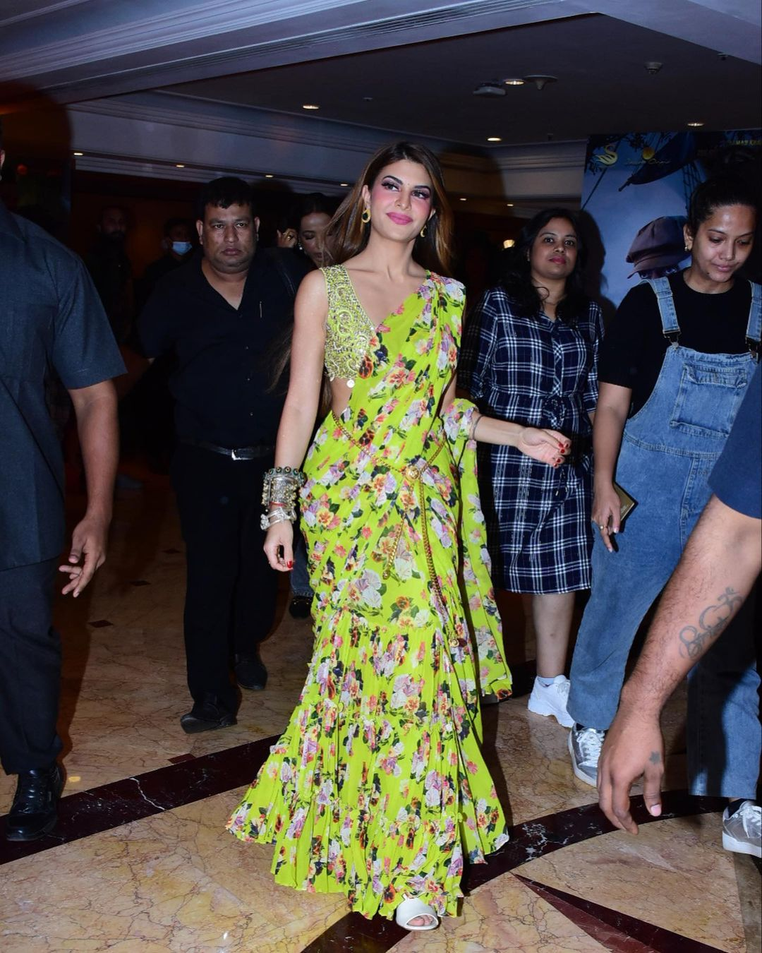 Jacqueline Fernandez in a bright green floral saree at the Vikrant Rona trailer launch was a sight to behold.