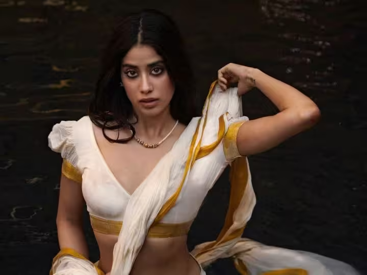जाह्नवी कपूर की इन फोटो में आप देख सकते हैं कि सफेद कलर की साड़ी में झरने में जाह्नवी अपने हुस्न से आग लगाती हुई दिख रही हैं.