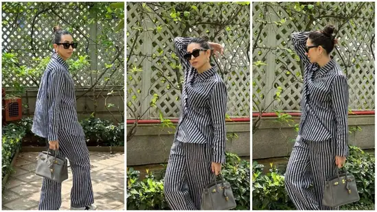 Karisma Kapoor shared a series of pictures of her OOTD as well as a small video flaunting her outfit on her Instagram handle and captioned it, "Stripe it."