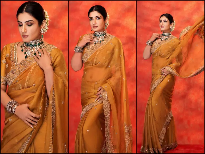 इन तस्वीरों को शेयर करते हुए रवीना टंडन ने कैप्शन में लिखा, “करवा चौथ के लिए तैयार, इस त्योहार के लिए केसरिया मेरा रंग है.”