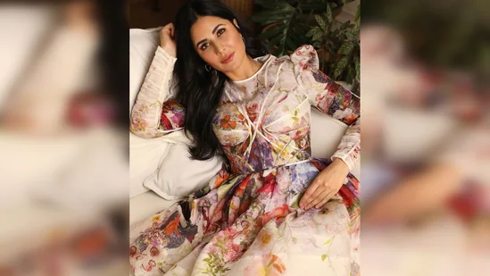 Katrina Kaif's outfit features subtle balloon shoulders, corset detailing and multi-coloured ombre floral prints.
