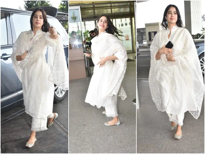 जाह्नवी ने इस दौरान व्हाइट कलर का सलवार कमीज पहना था. ऑल व्हाइट लुक में वह बलां की खूबसूरत लग रही थीं.