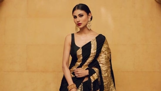 Mouni draped the six yards in traditional style, letting the pallu fall from her shoulder in a floor-grazing train.