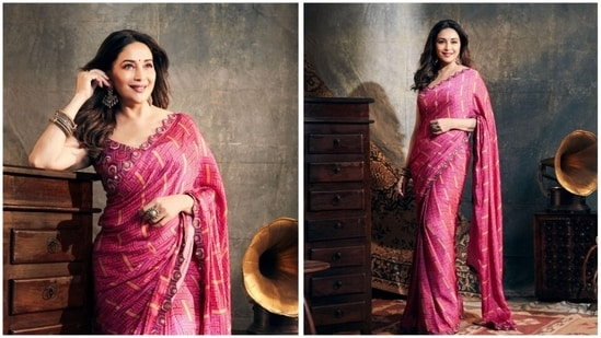 Madhuri Dixit draped a rani pink, block printed saree in geometrical motifs from the collection of designer Punit Balana.
