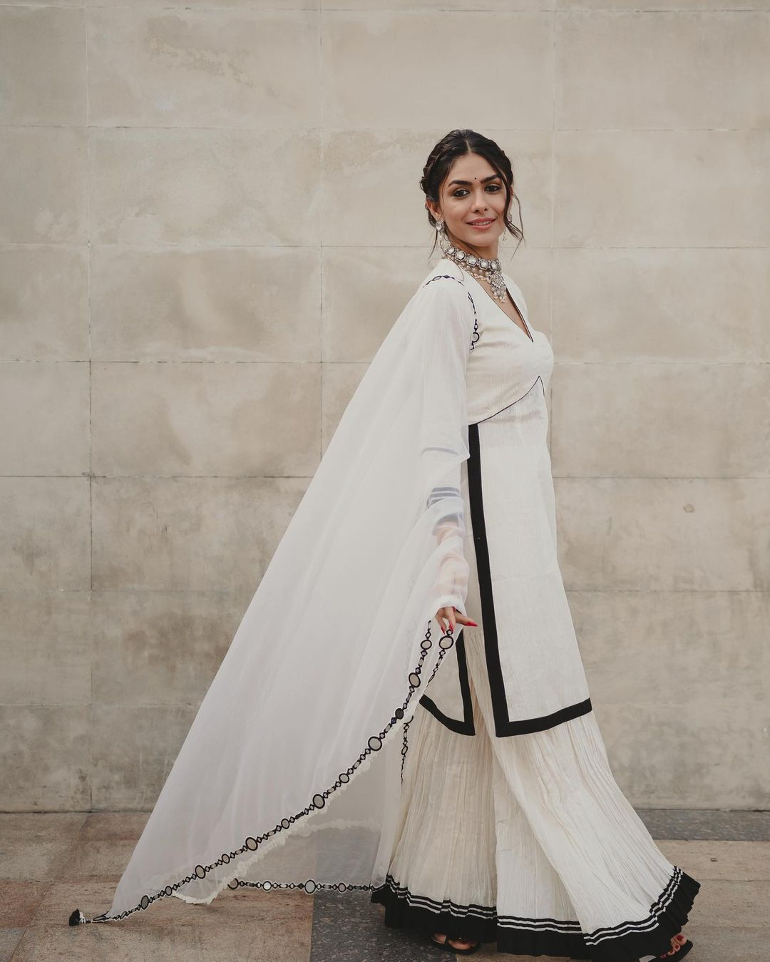 Mrunal, for the pictures, chose to go absolute ethnic in a monochrome ensemble.