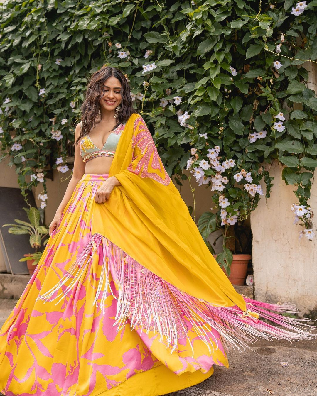 Mrunal teamed her blouse with a contrasting bright yellow flowy skirt intricately printed in quirky patterns of pink.