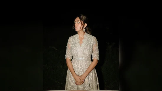 Mrunal Thakur's ivory anarkali set features intricate sequins work all over. The outfit comes with a matching cropped cape.