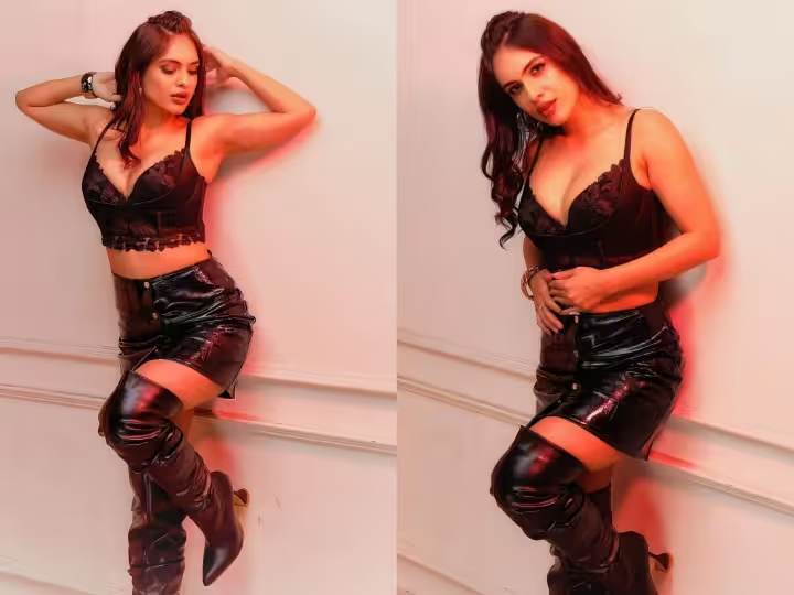 तस्वीरों में नेहा ब्लैक नेट वाली ब्रालेट के साथ लेदर की छोटी स्कर्ट पहने हुए कैमरे के लिए पोज दे रही हैं.