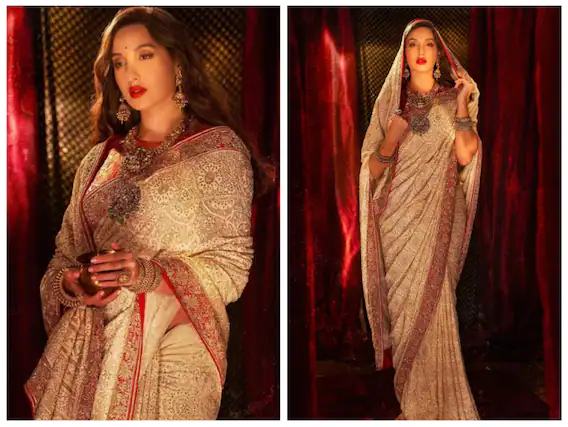 ऑफ व्हाइट साड़ी में नोरा फतेही की खूबसूरती गजब ढ़ा रही है. आप दिवाली पर इस तरह साड़ी पहन सकती हैं.
