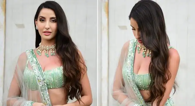इन तस्वीरों में नोरा फतेही लाइट ग्रीन कलर के कढ़ाईदार लहंगा सेट में हुस्न का जादू फैन्स पर बिखेरती नजर आईं।