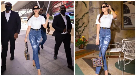 Nora Fatehi's personality shines through as she walks like a queen in a white bustier t-shirt, high-rise ripped skinny denim and pointed gold stilettoes.