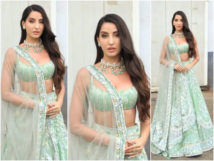 सामने आई इन तस्वीरों में नोरा फतेही ग्रीन कलर का खूबसूरत सा लहंगे पहने दिख रही हैं. साथ ही उन्होंने गले में खूबसूरत सा नेकलेस भी पहन रखा है.