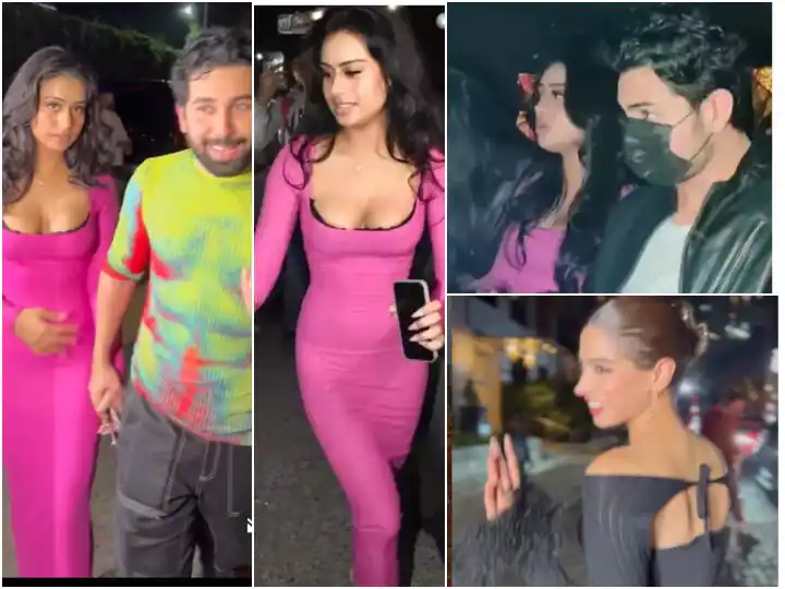 न्यासा देवगन ने इस दौरान पिंक कलर का डीप नेक बॉडीकॉन ड्रेस पहना हुआ था.