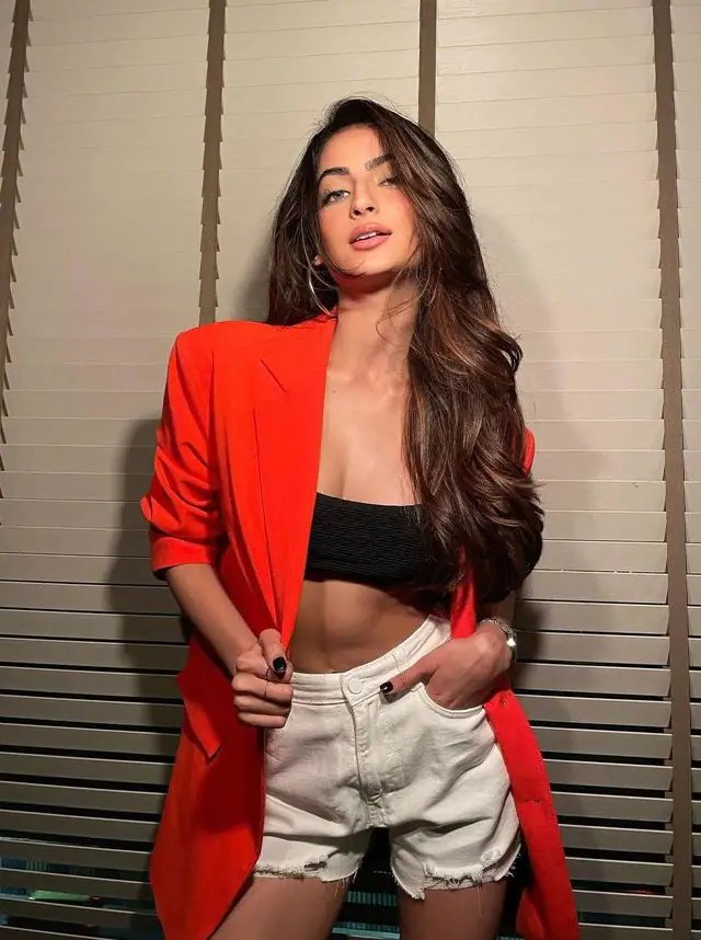 इन फोटोज़ में पलक तिवारी रेड ब्लेज़र के साथ ब्लैक ब्रालेट और व्हाइट डेनिम शॉर्ट्स में अपना कर्वी फिगर फ्लॉन्ट करती नजर आ रहीं हैं।