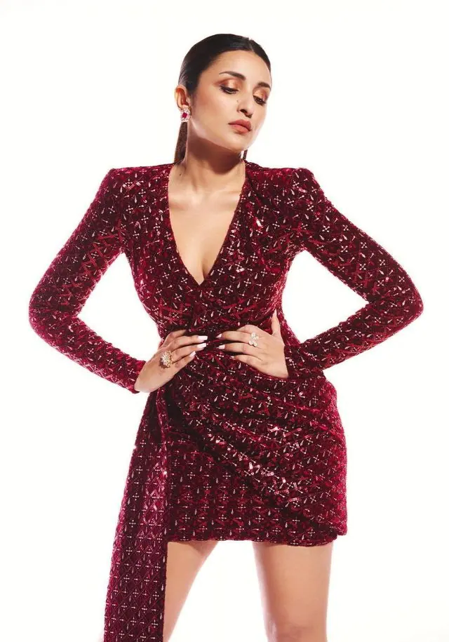 इन फोटोज़ में परिणीति चोपड़ा मरून शिमरी शॉर्ट ड्रेस में बेहद हॉट लग रहीं हैं और फैन्स उनकी अदाओं पर मर मिटे हैं।
