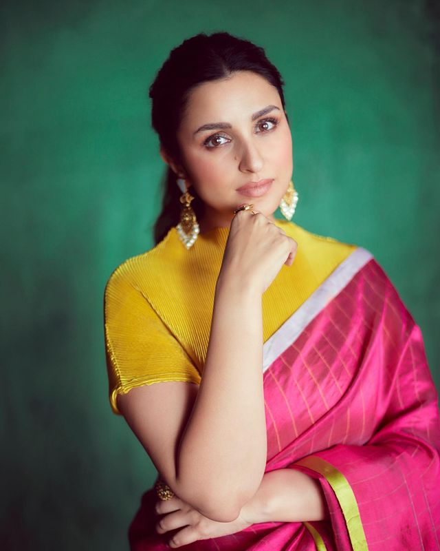 परिणीति चोपड़ा ने इस पिंक एंड येलो साड़ी में कैमरे के लिए मिलियन डॉलर के पोज़ दिए।