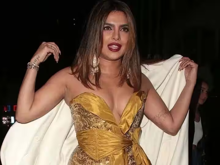उन्होंने गोल्डन कलर की थाई हाई स्लिट ड्रेस पहनी है. स्ट्रेपलेस गाउन में प्रियंका ने जमकर कहर ढाया है.