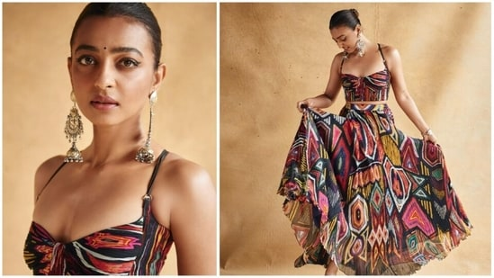 Radhika Apte's outfit comprises a corset-inspired strappy crop top and a long flowy skirt.