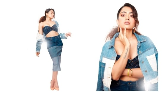 Rashmika Mandanna kept her promotional look trendy in all-denim outfit which comprises of a bandeau top, skirt and cropped jacket.