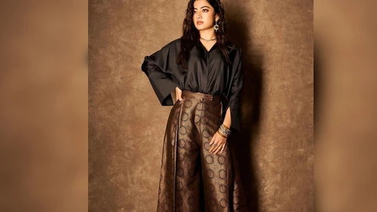 Rashmika Mandanna's outfit comes with a black satin oversized shirt with open sleeves and flared high-rise trousers.