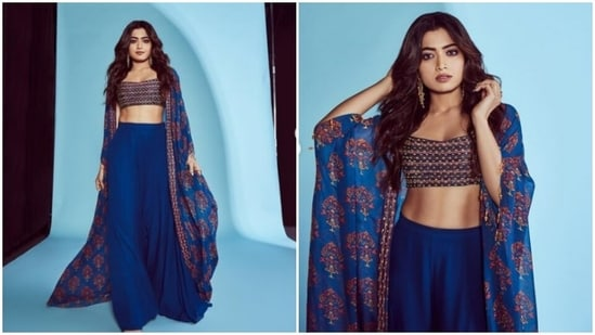 Rashmika played muse to fashion designer house DiyaRajvvir and picked a bright blue ensemble for the pictures.