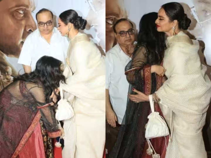 इस स्क्रीनिंग पर राजकुमार संतोषी की बेटी तनीषा संतोषी ने रेखा के पैर छूते हुए नजर आईं. तनीषा संतोषी को रेखा ने इसके बाद गले से लगा लिया.