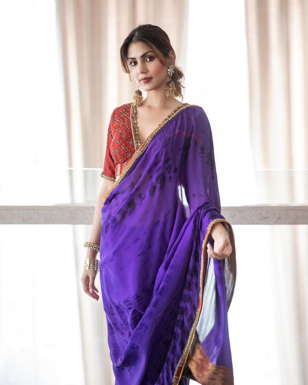Celebrity stylist Shreeja Rajgopal styled Rhea's look in the traditional ensemble. The photos show Rhea in a purple-coloured saree featuring a tie-dye pattern in a matching shade.