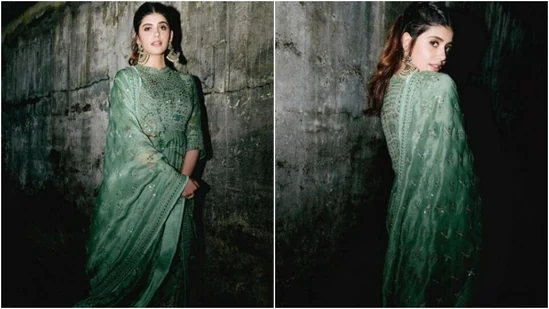 Sanjana looked every bit gorgeous in pastel green long gown embroidered in silver mirror work. She added a pastel green dupatta featuring minimal patterns in silver mirror work.