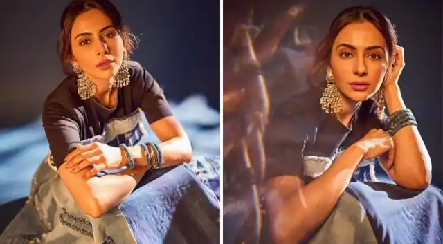 रकुल प्रीत ने ऑक्सीडाइज़्ड सिल्वर डैंगलर्स और डेनिम चूड़ियों के साथ अपने आउटफिट को टीमअप करके अपने कैज़ुअल लुक को 360 ट्विस्ट दिया।