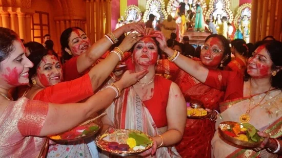 Bengali women played sindoor khela in Thane, Mumbai on Wednesday as they bid farewell to Durga Maa for this year.