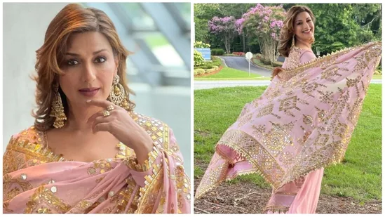 Sonali Bendre shared a slew of photos of herself waving the Indian flag in a pink salwar suit by the designer duo Abu Jani and Sandeep Khosla.
