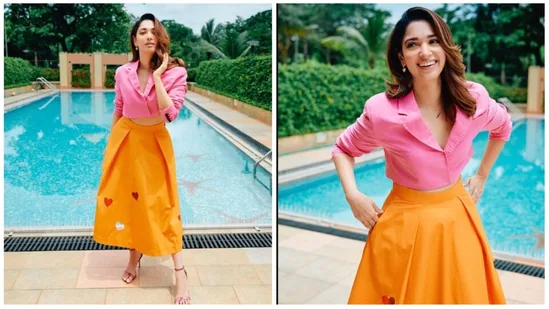 Tamannaah Bhatia's outfit comes with a pink cropped blazer and a high-rise orange skirt featuring heart prints.