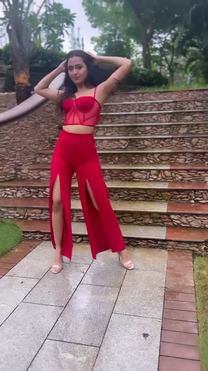 In this clip, the actress is looking very hot wearing matching front cut straight pants with red colored corset top and during this she is wearing dark red lipstick.
