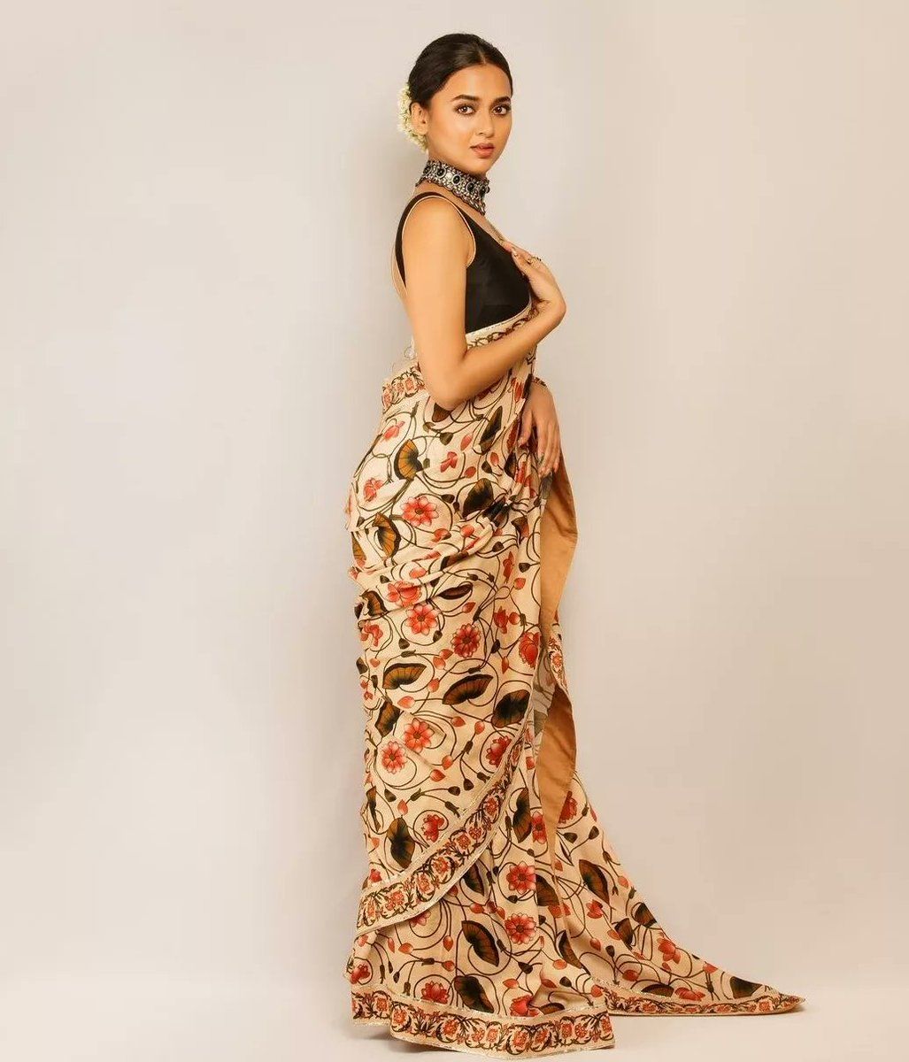 She is looking beautiful in a stunning light floral saree. Tejashwi is wearing a backless blouse with this saree.
