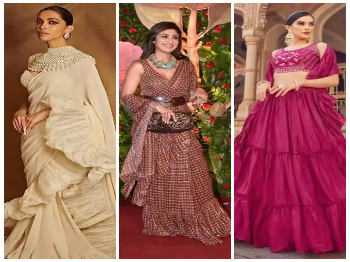 इन दिनों रफल लहंगा साड़ी भी काफी चलन में है. इसमें नीचे लहंगे की तरह लेयर्स दिए रहते हैं और ऊपर से चुन्नी अटैच करके पल्लू दिया रहता है.