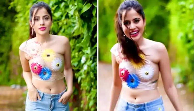 This time around, it is no blade, safety pin or rope that Urfi Javed used for creating an outfit. All that she used was a roll of plastic wrap and a few colourful plastic flowers.
