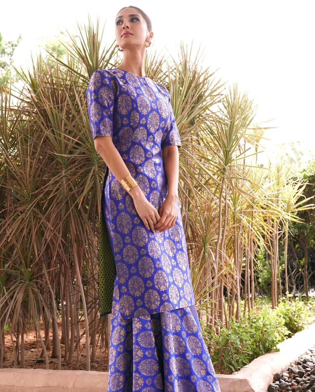 Vaani Kapoor ditched western attires for this gorgeous royal blue brocade palazzo set to promote her upcoming film Shamshera.